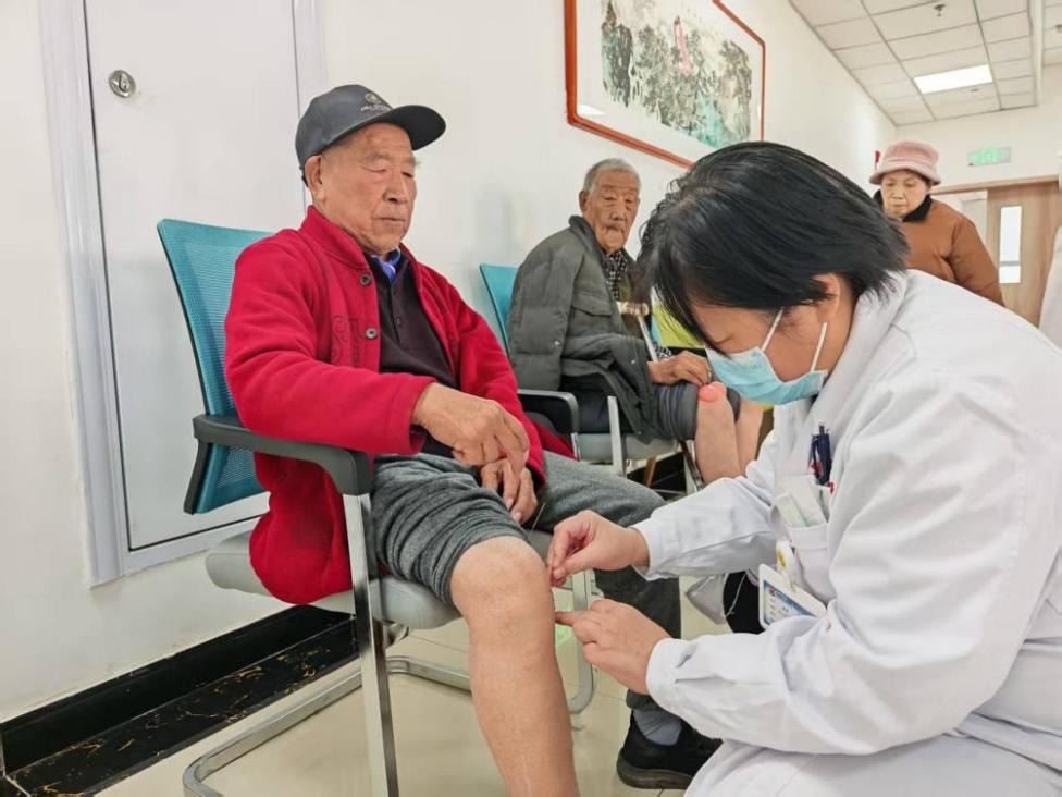 中医科党支部同步开展中医辨证施治服务,运用拔罐、针灸等传统疗法,为颈肩腰腿疼痛老人提供特色理疗服务。通过温热罐具与精准穴位推拿,有效缓解老人不适,获得一致好评。