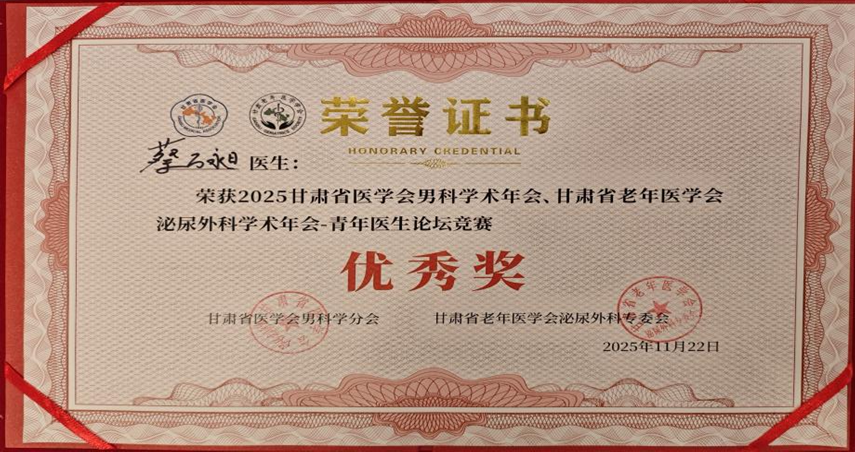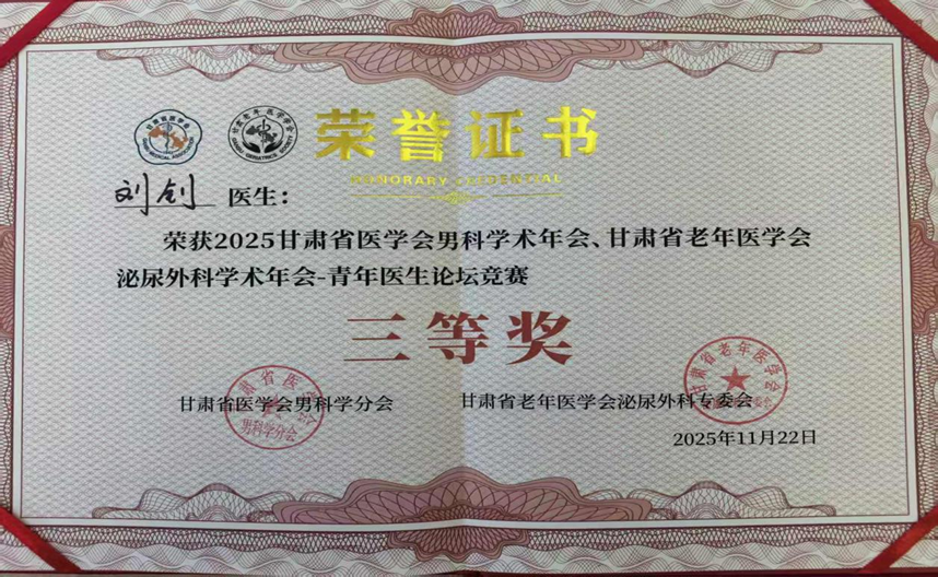 【喜报】我院医师在“2025甘肃省医学会男科学术年会、甘肃省老年医学会泌尿外科学术年会-青年医师论坛竞赛”中喜获佳绩发表时间:2025-12-01 10:52 近日,由甘肃省健康管理研究会主办,甘肃省人民医院、白银市第一人民医院承办的“2025甘肃省医学会男科学术年会、甘肃省老年医学会泌尿外科学术年会-青年医师论坛竞赛”圆满落幕。全省青年医师齐聚赛场同台竞技,我院参赛队员经过不懈努力与拼搏,荣获个人“三等奖”1项,个人“优秀奖”1项的好成绩,彰显了我院在泌尿外科专业领域的过硬实力与人才培养成效。