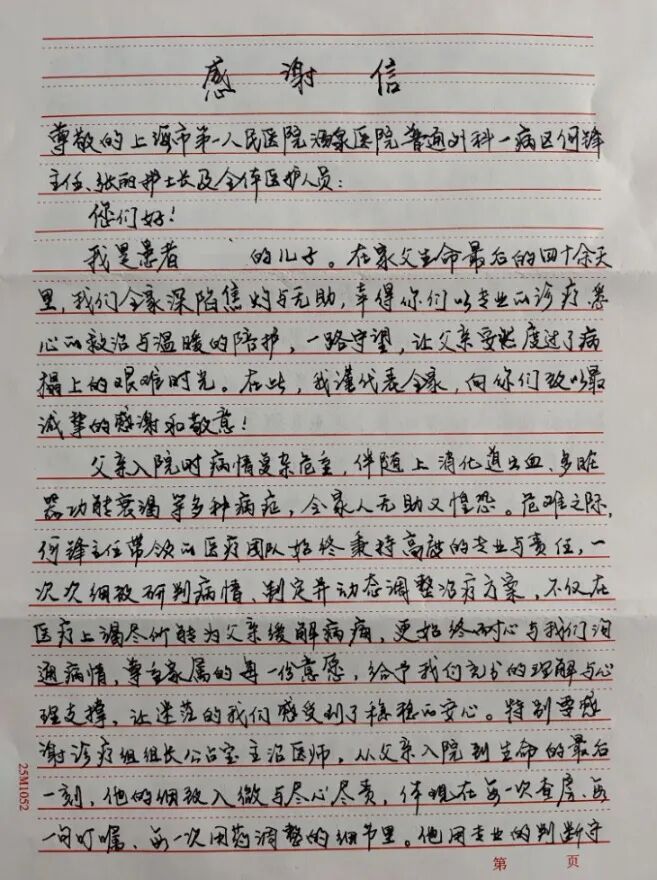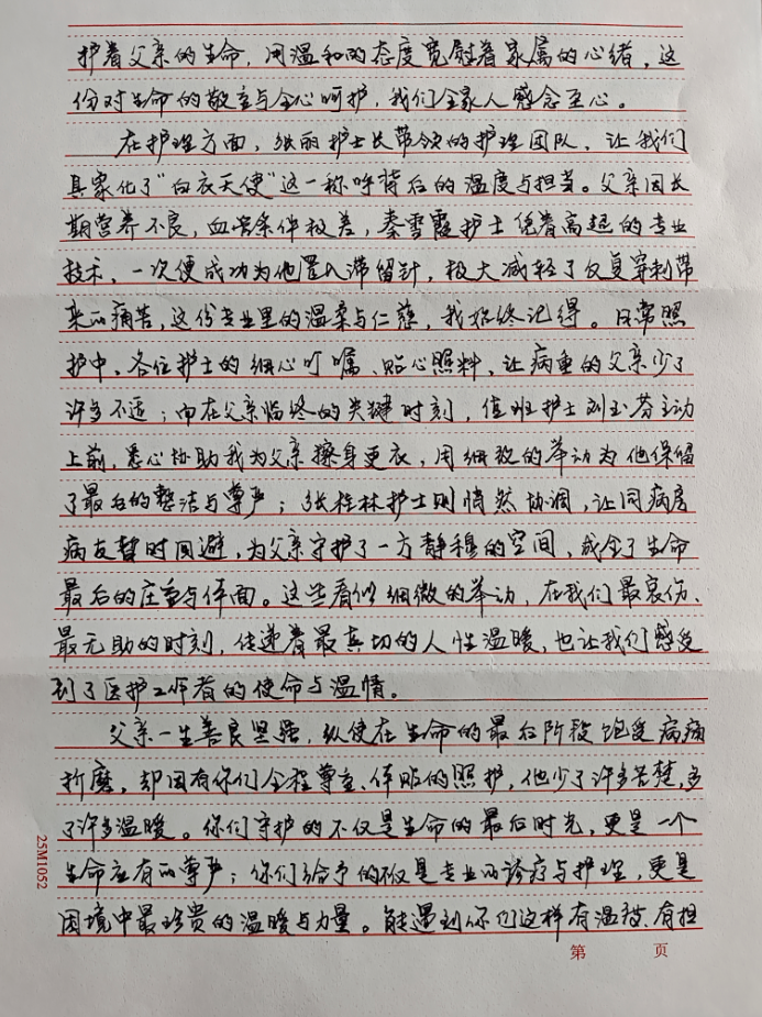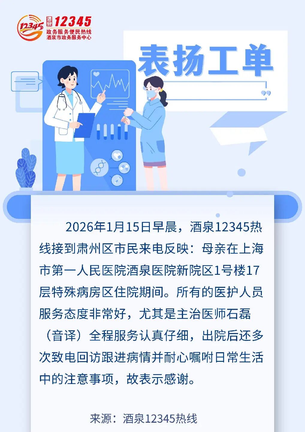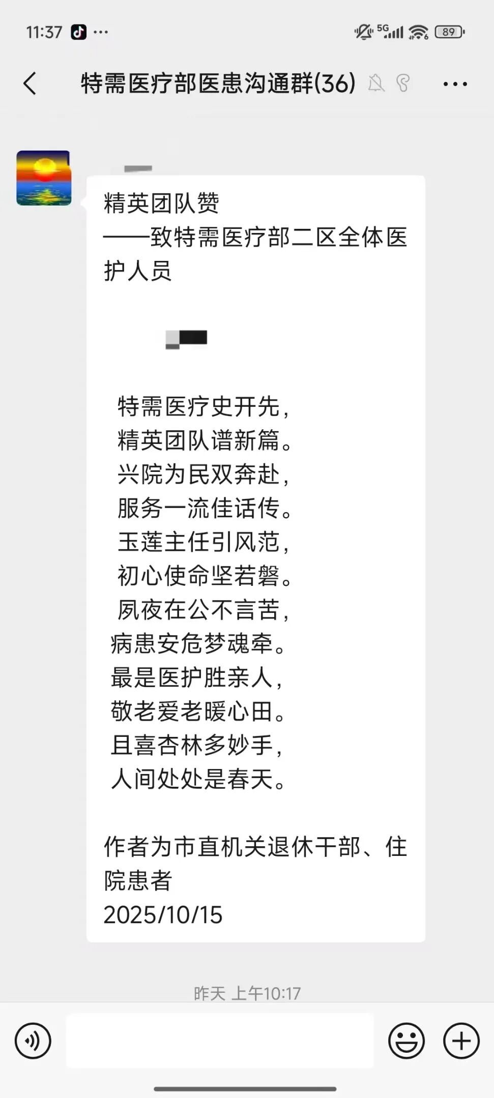 【医德医风】纸短情长 温暖医患——聚焦患者点赞的“身边好医护”发表时间:2026-01-27 10:56 近日,医院收到多份特殊的“礼物”——来自患者及家属的感谢留言与锦旗表扬。表达了患者对我院医务人员精湛医术、优质服务及高尚医德的充分肯定与感激之情,彰显了我院医护队伍践行“以患者为中心”的责任担当。 纸短情长,医者仁心。这些感谢留言与锦旗,既是医患同心的温暖见证,更是我院推动“党建+医疗服务”深度融合的成果体现。在此,特对收到感谢的同事们提出表扬,并号召全院职工以他们为榜样,见贤思齐,精益求精,继续弘扬新时代医疗卫生职业精神,以更专业的技术、更温暖的服务护航百姓健康,持续提升患者就医获得感与满意度。 附:部分患者感谢留言及赠送锦旗