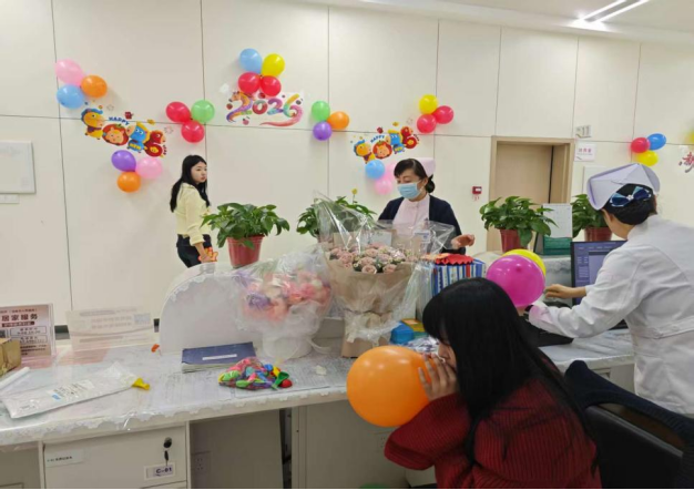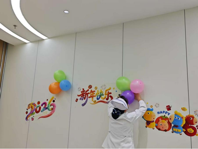 为营造浓厚的新春氛围,儿科医护人员化身 “装扮使者”,利用休息时间亲手装点科室环境。候诊大厅内,鲜艳的红灯笼、吉祥的中国结与可爱的卡通新春贴纸相映成趣,柔和的暖光笼罩整个空间,取代了往日医疗环境的严肃感;输液大厅里,色彩柔和的新春气球错落悬挂,医护人员还为小患儿们准备了卡通窗花、生肖挂饰,让孩子们在输液过程中也能感受到节日的快乐;护士站被春联、福字点缀得暖意融融,健康宣教栏同步更新为新春专属版本,在普及儿童健康防护知识的同时,送上 “新春安康”“茁壮成长” 的真挚祝福。